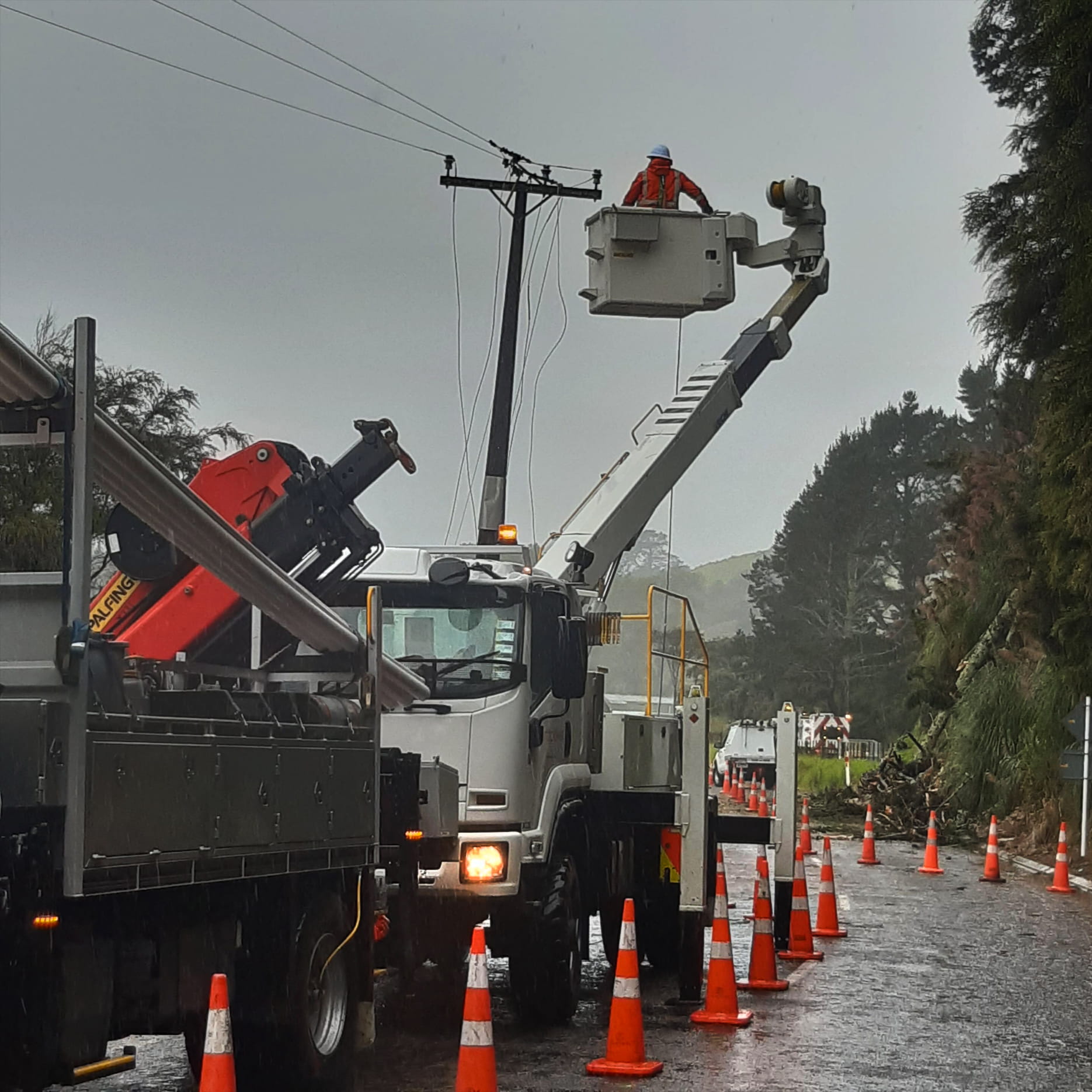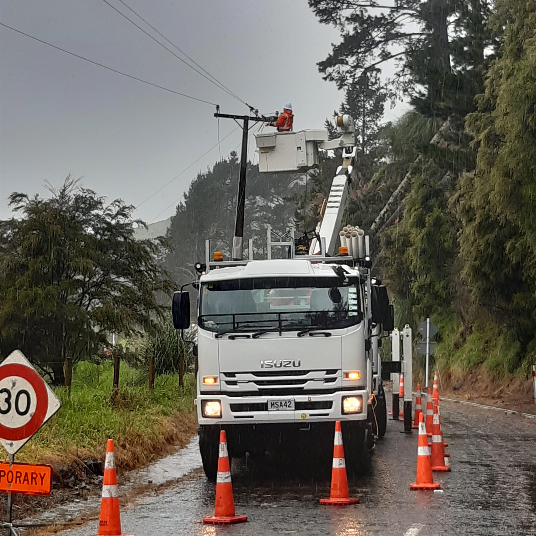 Field crews reconnecting customers in Whangamatā Monday afternoon