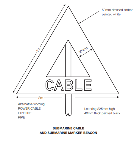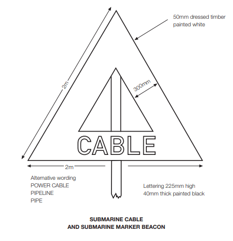 The cables are marked with triangular warning signs onshore at each end of the cable and by buoys on the water (scroll down for example). It’s important to look out for these signs while on your boat or other watercraft so you know where the cables are and can avoid them.