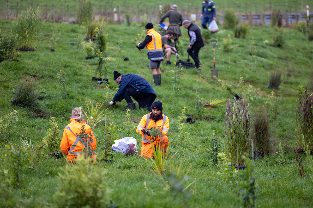 Replant South Waikato saw us partner with the Pokaiwhenua Catchment Group to restore and enhance the wellbeing of the catchment for the benefit of the environment and community. Nearly 100 locals, farmers and school kids, as well as people from the South Waikato District Council, Downer, Farmlands, Fonterra and Powerco teamed up for a day of planting in the Duxfield Reserve in Putāruru, planting 4,500 plants in two hours.